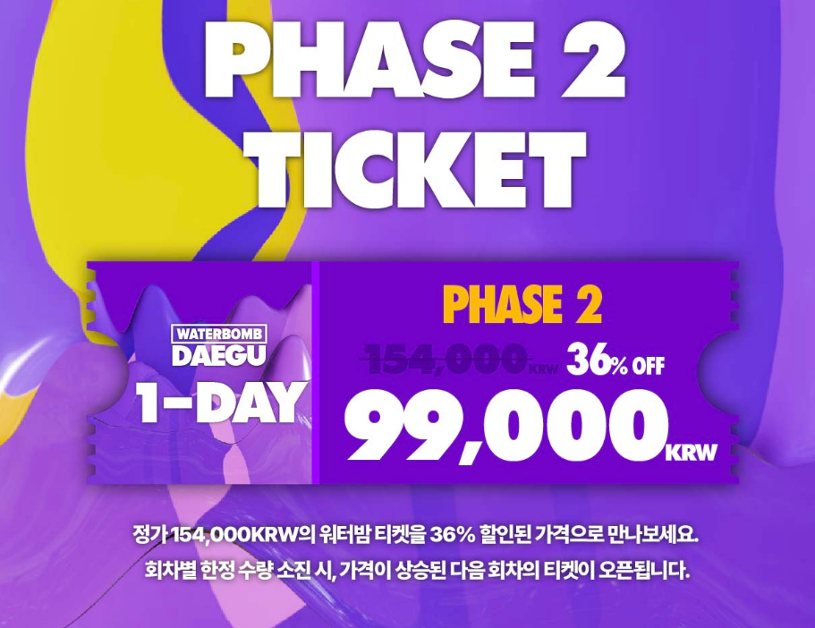매회차 열기가 더해가고 있는 워터밤이 7월 20일에 대구에서 열립니다. 워터밤 대구티켓이 36% 할인된 가격 99,000원에 예매가 가능합니다. 한정수량으로 소진될 수 있으니 서두르시기 바랍니다. 신나는 워터밤 할인된 가격으로 예매하셔서 즐겁고 신나게 즐기시길 바라겠습니다.